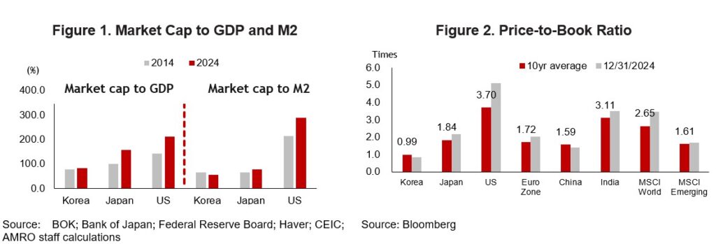 Over the past decade, Korea’s market capitalization relative to GDP has remained stagnant, while those of major markets such as the US and Japan have grown significantly (Figure 1). The average price-to-book ratio (PBR) of the benchmark KOSPI index has hovered around 0.99 – well below that of advanced and emerging market peers (Figure 2). In effect, a large share of Korean listed companies continues to trade below book value, suggesting that the market values them less than the net assets.